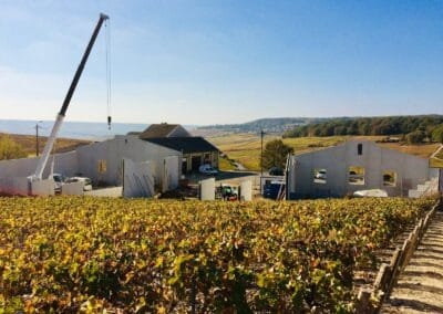 Réalisation emblématique pour bâtiments agricoles et viticoles : réalisation d’un bâtiment viticole (51-champillon). Niché au cœur des vignobles champenois à Champillon (51), ce chai moderne en cours de montage par grue intègre des panneaux préfabriqués robustes, des ouvertures stratégiques pour la ventilation et une structure optimisée pour la vinification. Entouré de rangs de vignes dorés sous un ciel azur, ce projet allie fonctionnalité professionnelle, durabilité et respect du terroir, contribuant à l’excellence viticole de la région.